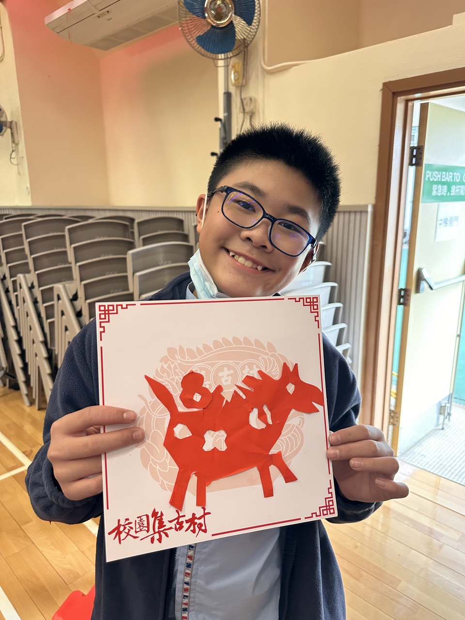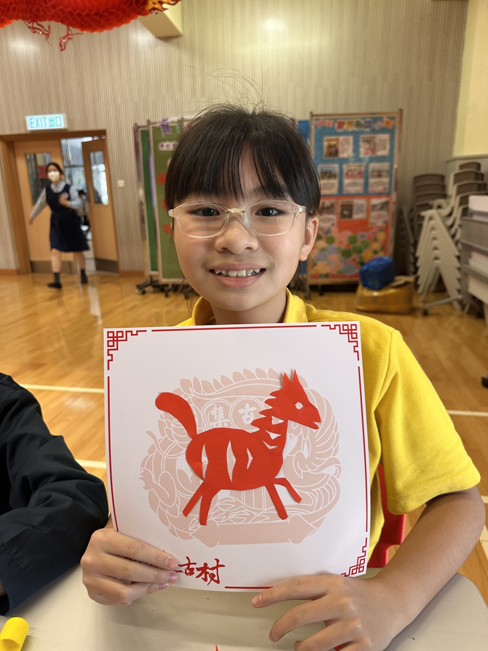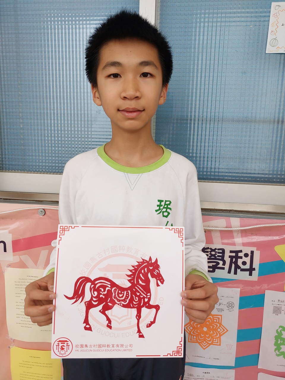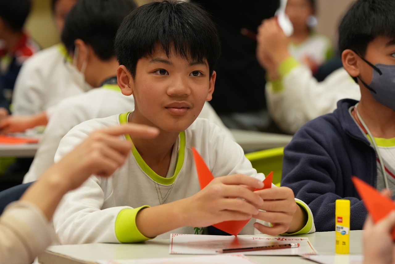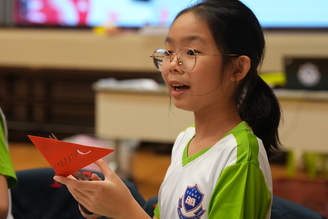 活動當天,學生親手剪出兩張剪紙圖案,第一張剪紙是窗花圖案,學生需剪出「軸對稱圖形」,當中的圖案需有2-4條對稱軸;第二張剪紙是配合馬年的小馬圖案。學生初步體驗剪紙的技巧,剪出獨一無二的圖案,他們表現投入,上了愉快的一課。