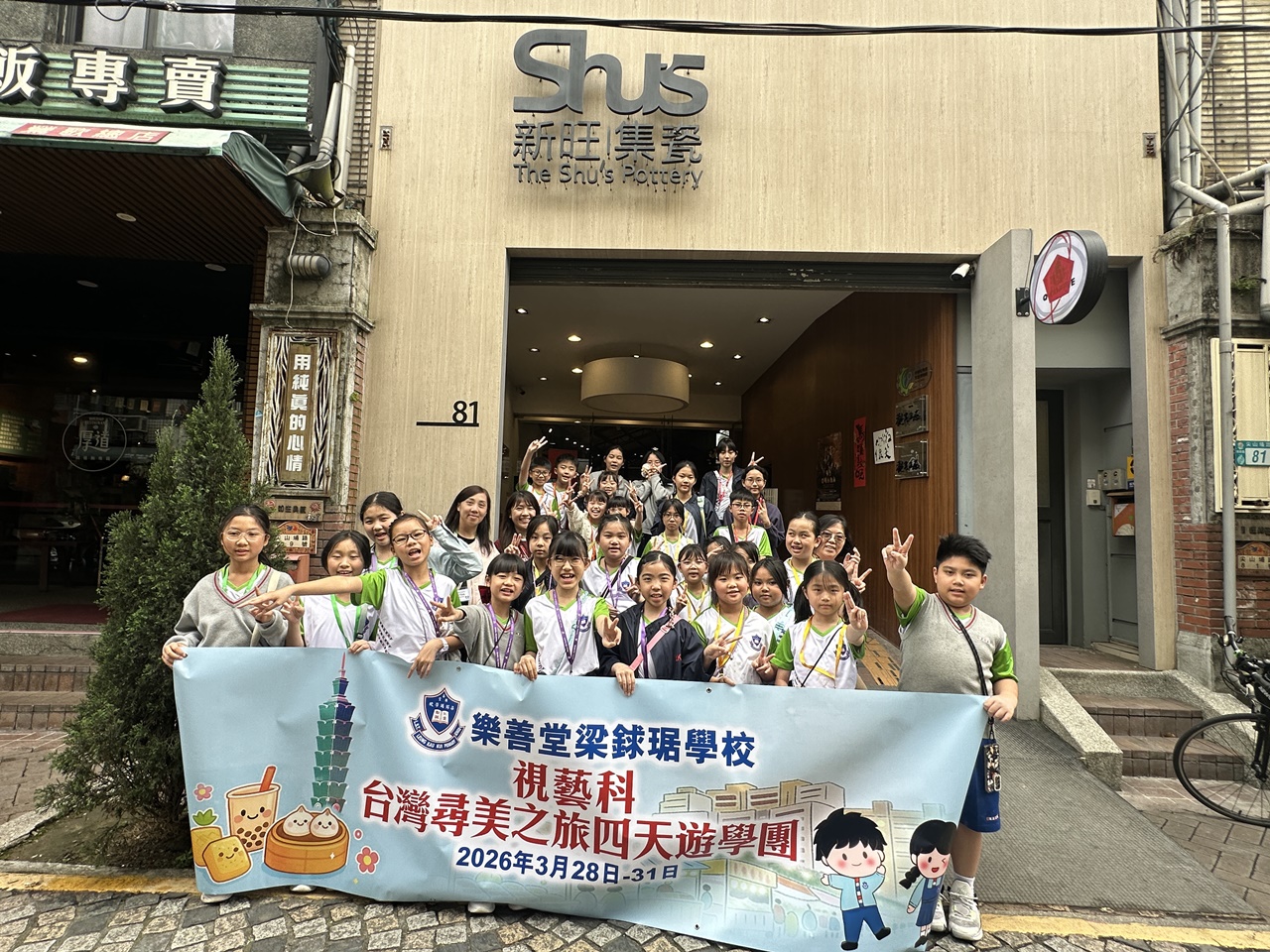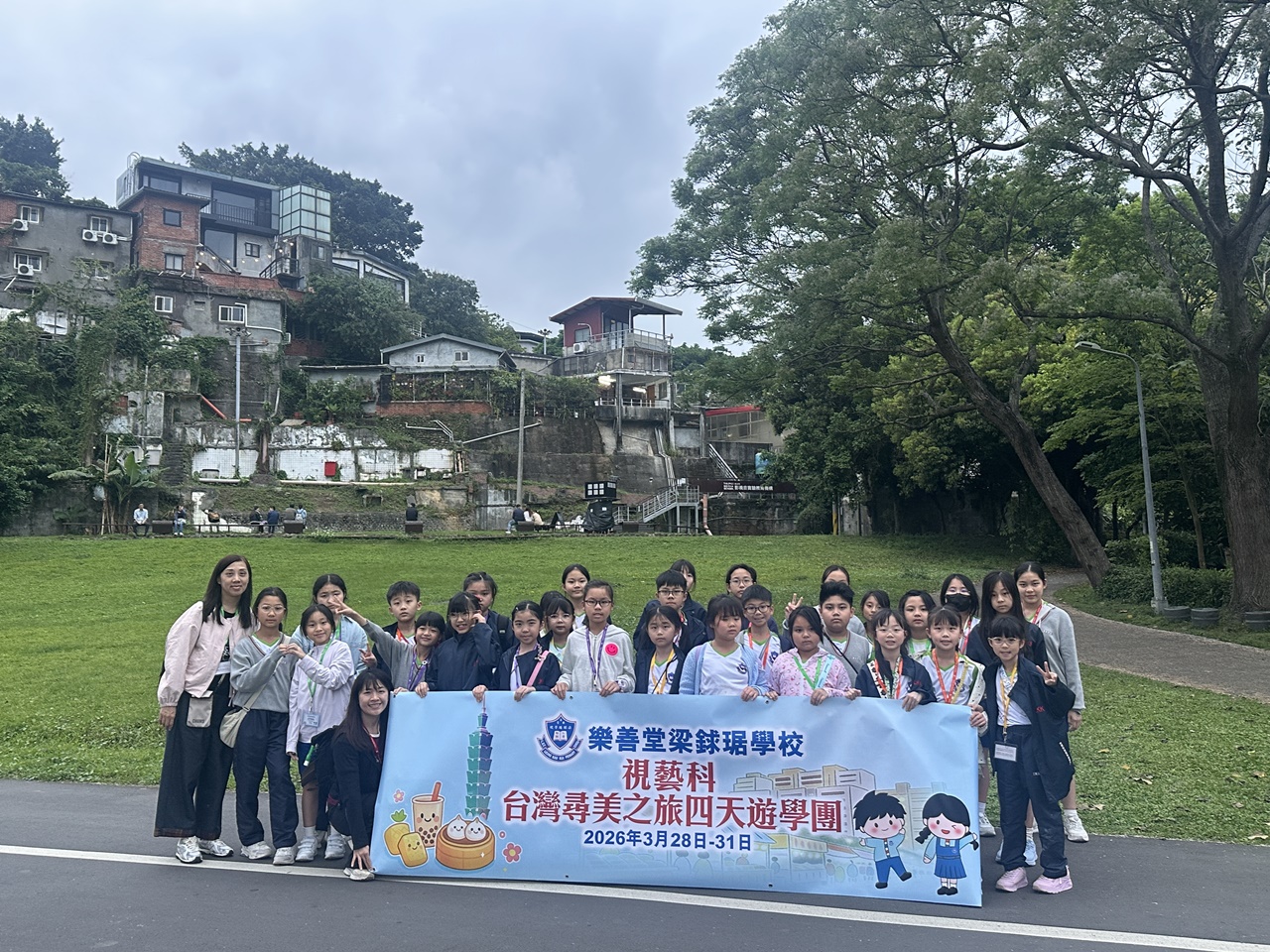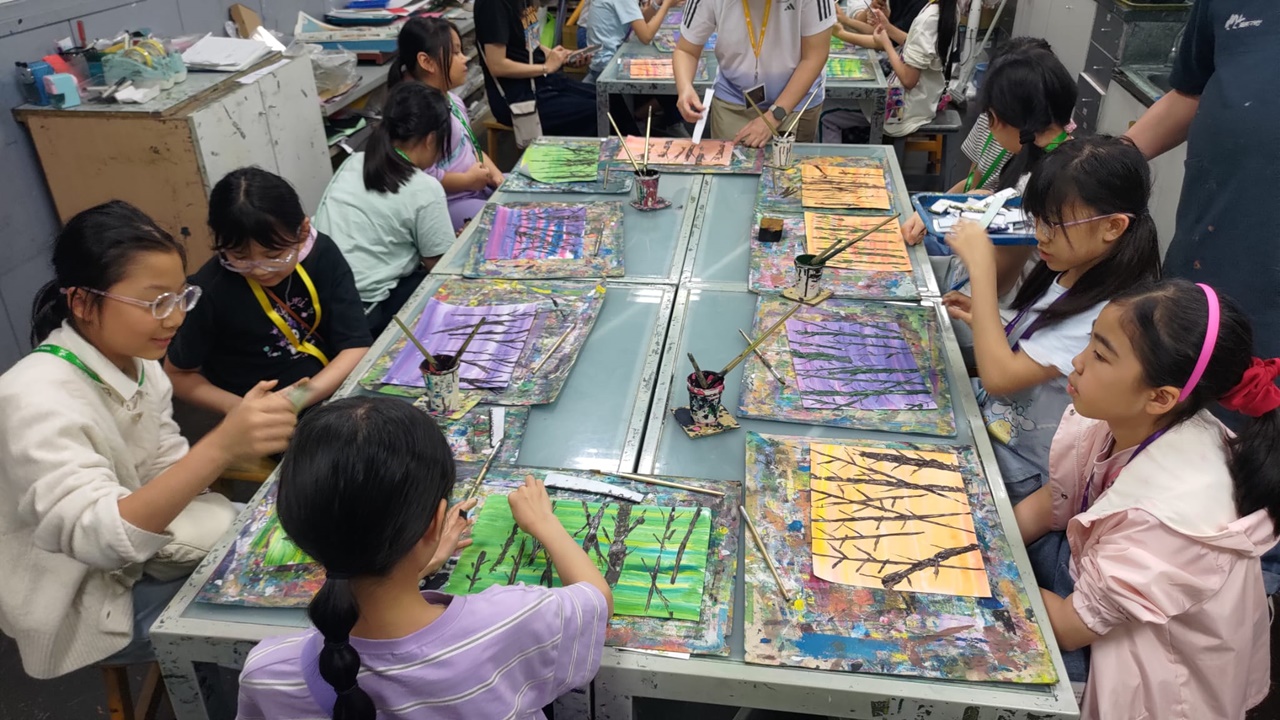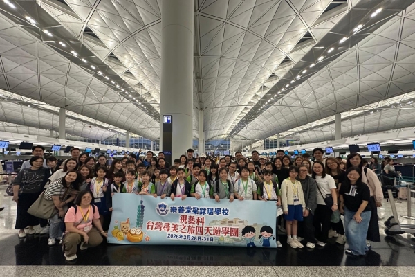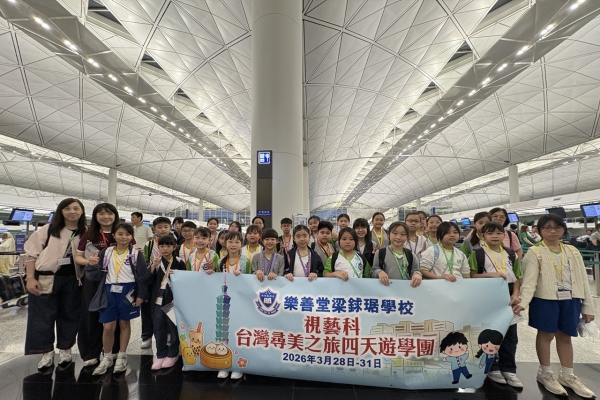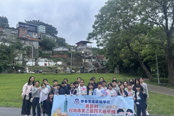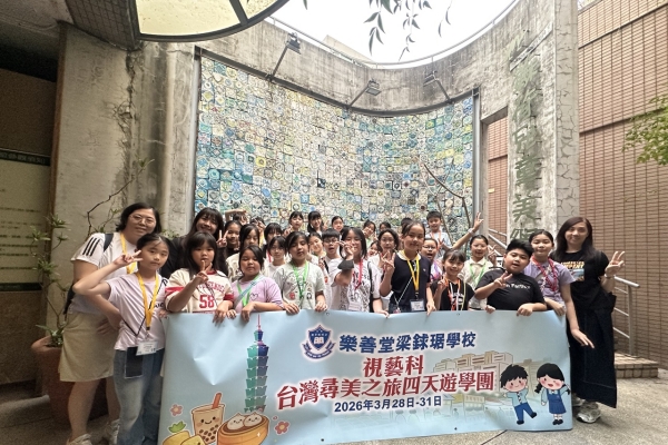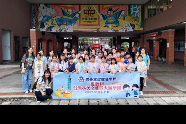 「台灣尋美之旅四天遊學團」已於28-31/3/2026順利完成。由劉家怡老師、郭雅志老師及陳秀嫻老師帶領29位四至六年級的學生展開了四日三夜的「台灣尋美之旅」。同學們參觀了不同的藝術展館,包括蘇荷美術館、 新北市立藝術館、台北偶戲館、國立臺灣藝術教育館、寶藏巖國際藝術村、關渡美術館及兒童藝術中心,並進行了水彩畫課程及手拉坯DIY陶瓷;參觀樹火紀念紙博物館,一起嘗試造紙體驗;到訪國立臺北教育大學附設實驗國民小學,與當地小學進行交流,參觀校園及進行體驗視藝課程——植物拓印。在這次活動中,同學們透過到訪、參觀、考察和創作活動,親身了解藝術情景,培養美感觸覺和正面的生活態度。