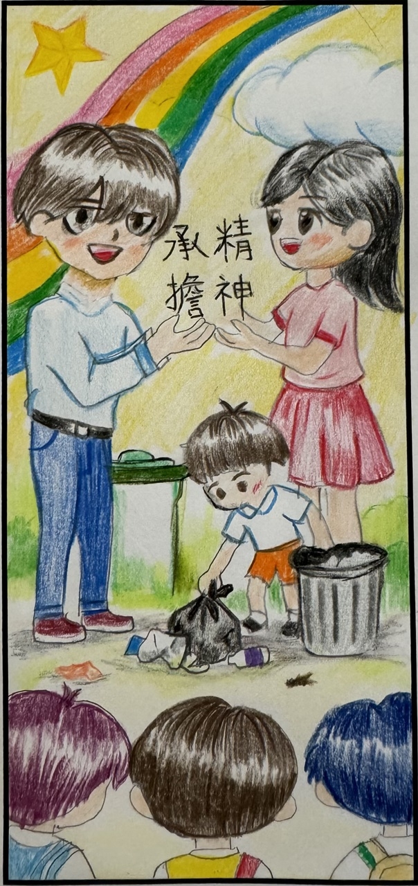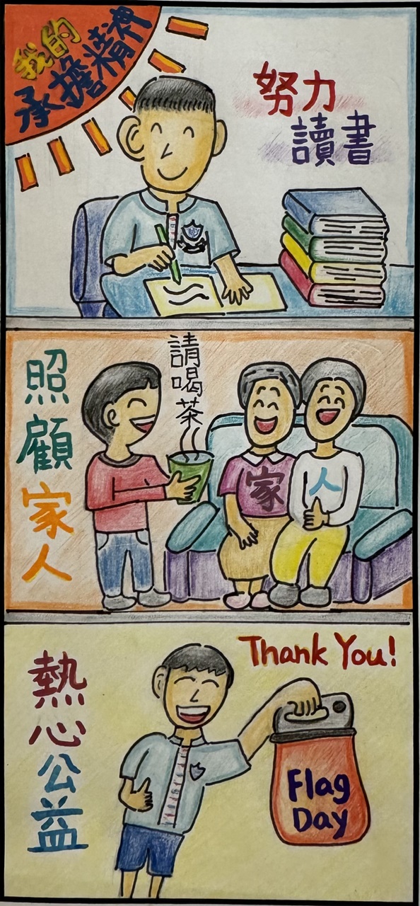 為加強學生對「承擔精神」、「仁愛」、「守法」及「誠信」等四個價值觀和態度的認識,視藝科舉辦了「閃亮品格親子襟章設計比賽」,同學們的得獎作品都別出心栽,很有創意,恭喜各位獲獎同學。