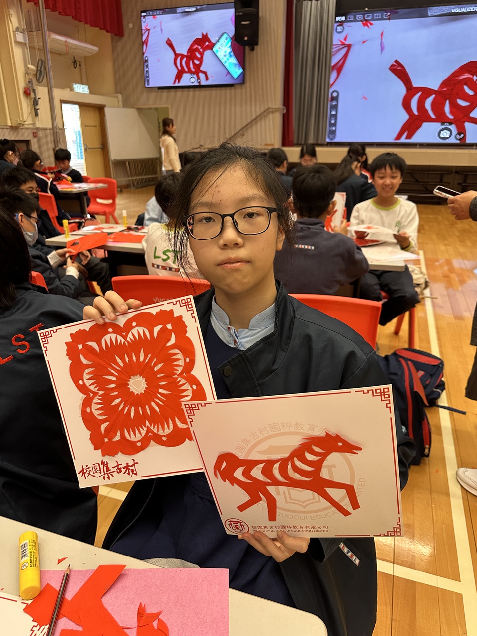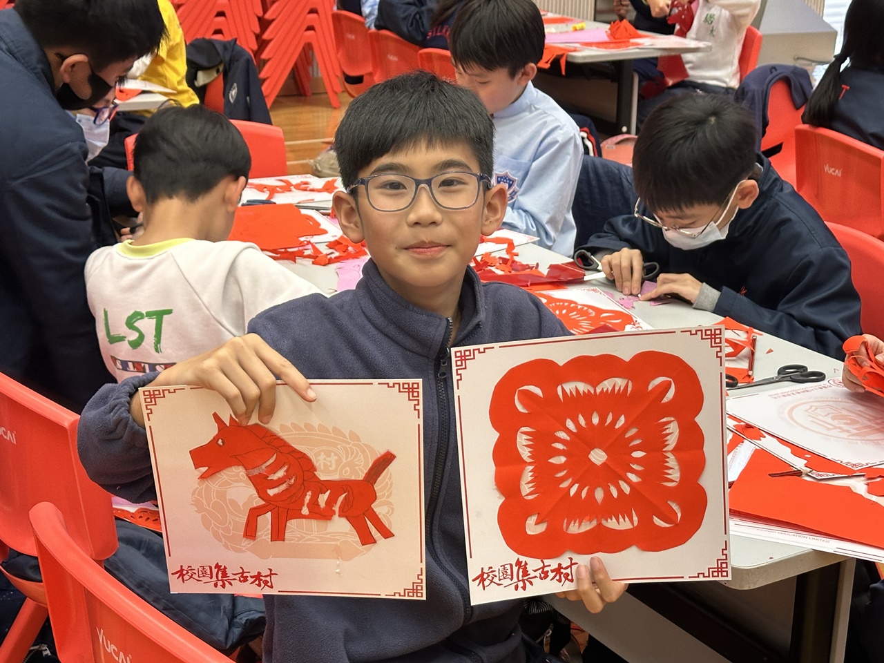 活動當天,學生親手剪出兩張剪紙圖案,第一張剪紙是窗花圖案,學生需剪出「軸對稱圖形」,當中的圖案需有2-4條對稱軸;第二張剪紙是配合馬年的小馬圖案。學生初步體驗剪紙的技巧,剪出獨一無二的圖案,他們表現投入,上了愉快的一課。