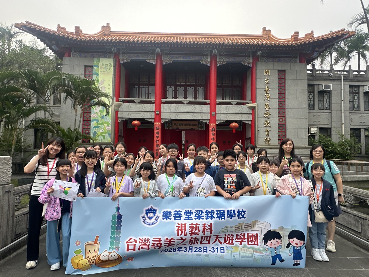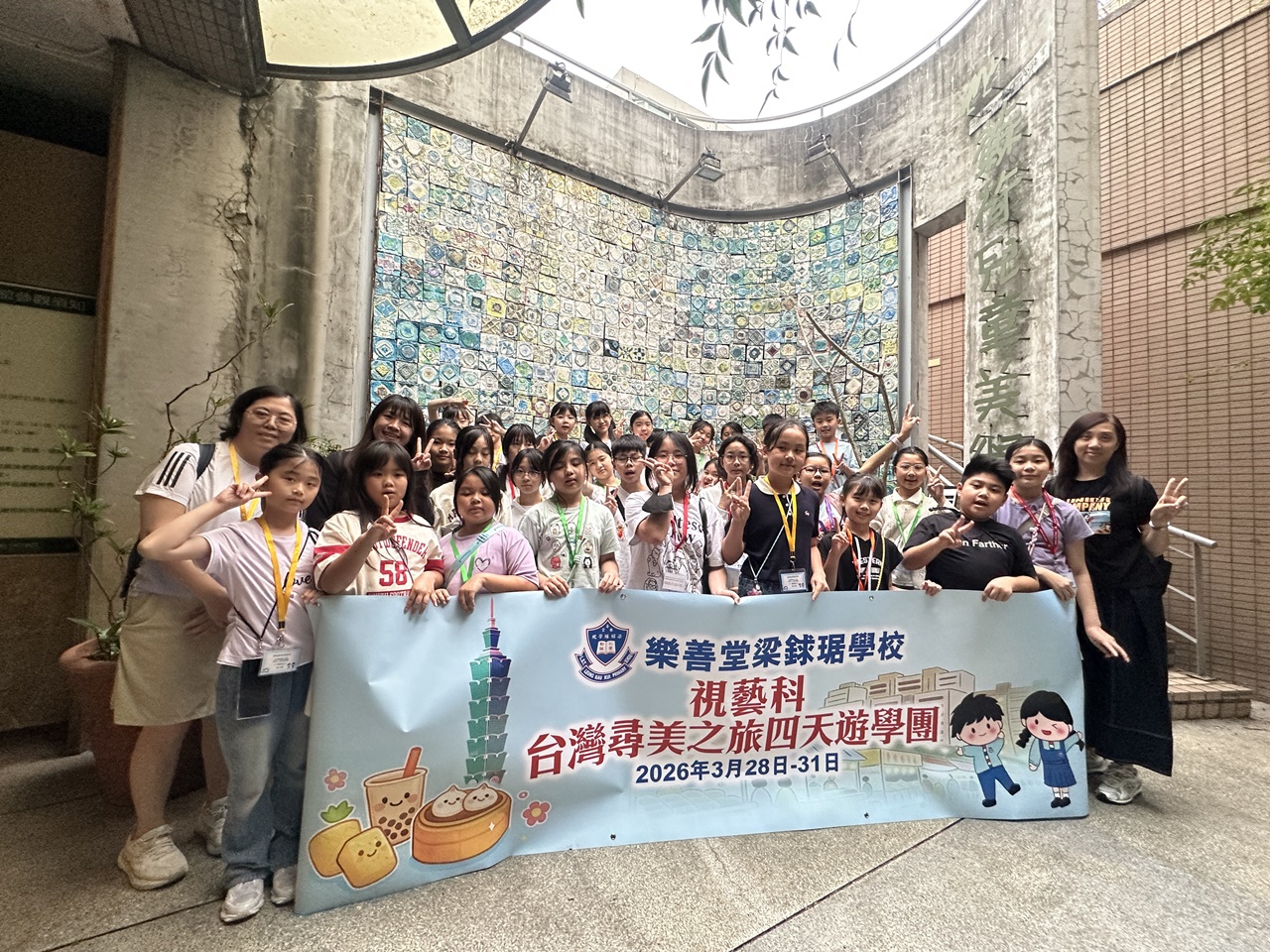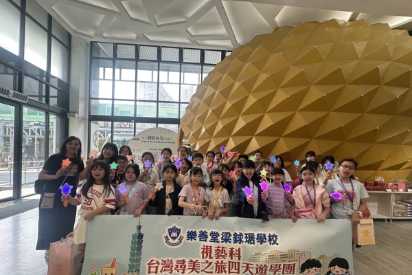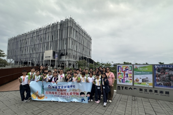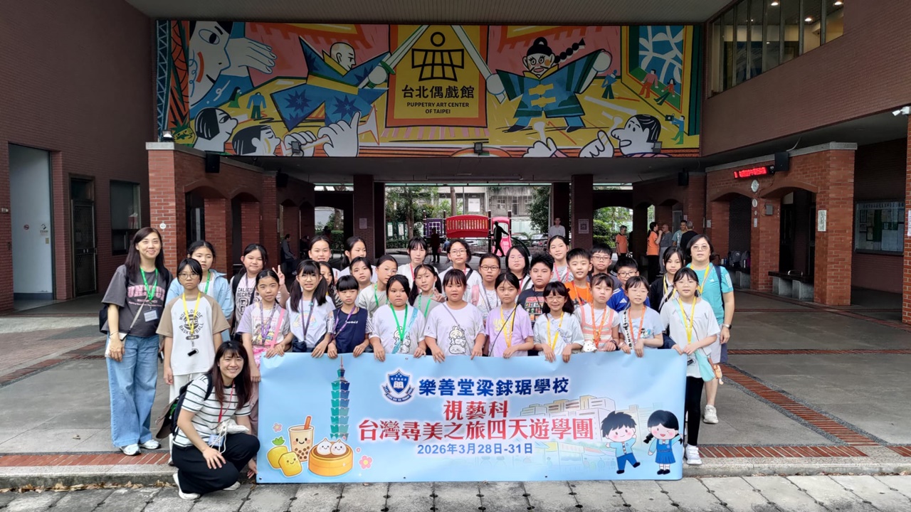 「台灣尋美之旅四天遊學團」已於28-31/3/2026順利完成。由劉家怡老師、郭雅志老師及陳秀嫻老師帶領29位四至六年級的學生展開了四日三夜的「台灣尋美之旅」。同學們參觀了不同的藝術展館,包括蘇荷美術館、 新北市立藝術館、台北偶戲館、國立臺灣藝術教育館、寶藏巖國際藝術村、關渡美術館及兒童藝術中心,並進行了水彩畫課程及手拉坯DIY陶瓷;參觀樹火紀念紙博物館,一起嘗試造紙體驗;到訪國立臺北教育大學附設實驗國民小學,與當地小學進行交流,參觀校園及進行體驗視藝課程——植物拓印。在這次活動中,同學們透過到訪、參觀、考察和創作活動,親身了解藝術情景,培養美感觸覺和正面的生活態度。