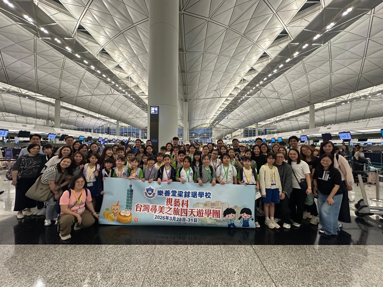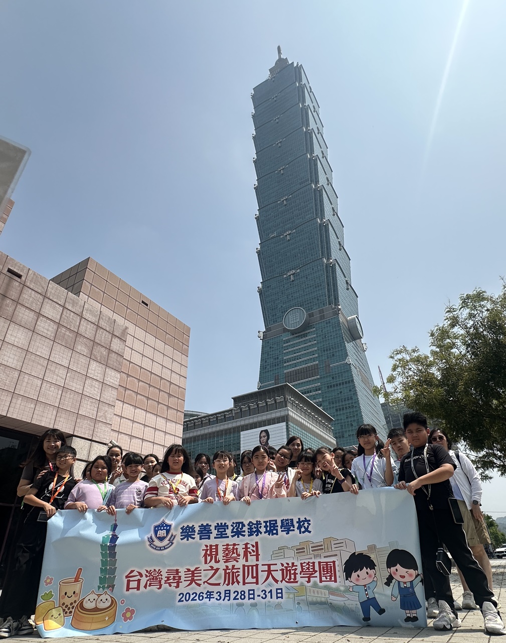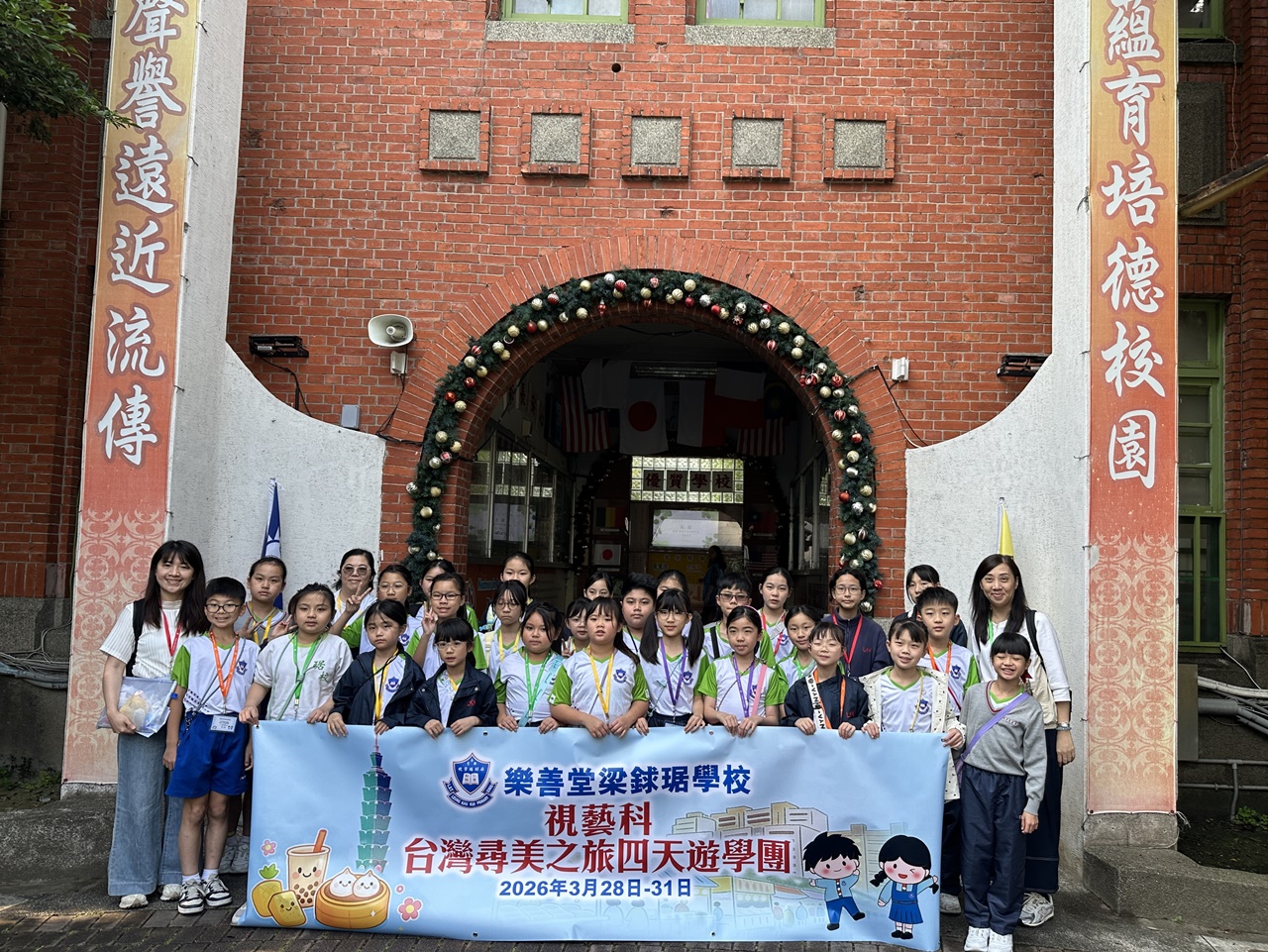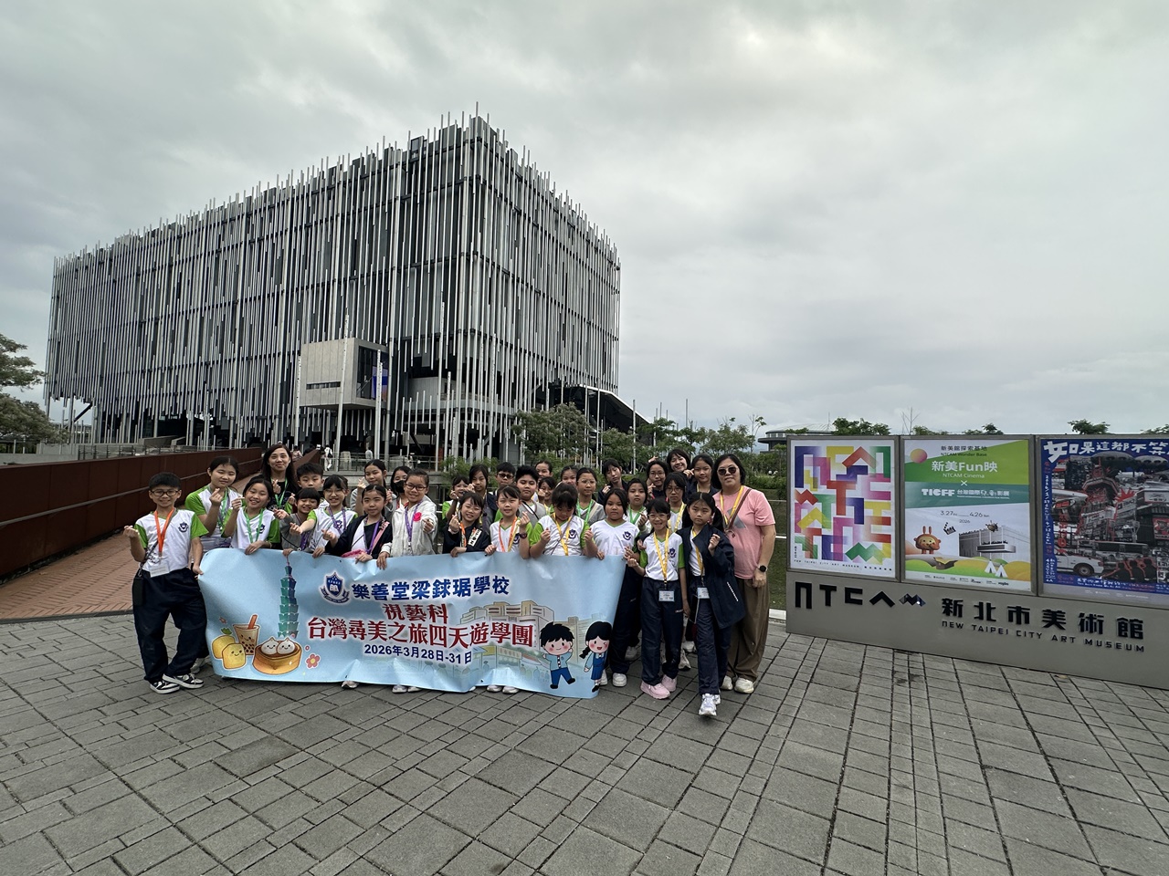 「台灣尋美之旅四天遊學團」已於28-31/3/2026順利完成。由劉家怡老師、郭雅志老師及陳秀嫻老師帶領29位四至六年級的學生展開了四日三夜的「台灣尋美之旅」。同學們參觀了不同的藝術展館,包括蘇荷美術館、 新北市立藝術館、台北偶戲館、國立臺灣藝術教育館、寶藏巖國際藝術村、關渡美術館及兒童藝術中心,並進行了水彩畫課程及手拉坯DIY陶瓷;參觀樹火紀念紙博物館,一起嘗試造紙體驗;到訪國立臺北教育大學附設實驗國民小學,與當地小學進行交流,參觀校園及進行體驗視藝課程——植物拓印。在這次活動中,同學們透過到訪、參觀、考察和創作活動,親身了解藝術情景,培養美感觸覺和正面的生活態度。